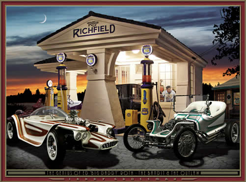 Two of Ed "Big Daddy" Roth's most famous cars are featured in front of a beautiful 1920's-30's era Richfield service station. "Big Daddy" himself is inside the station's office, and the "Rat Fink" (flies and all!) is visible in the shed to the right. In addition, Roth's "Rotar" air car is parked in the background. -- L.G. |