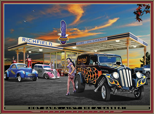 It's a gathering of some very hot Gassers at Smitty's classic Richfield station. Out on the left island is one of the most famous gassers of all time, the legendary Stone, Woods and Cook "Swindler A" '41 Willys. Next to that is "The Dalton Gang's" nifty flamed '48 Anglia. And in the foreground is "Catch Me If You Can", a wild '33 Willys sedan delivery. Behind the '33 Willys is a fine '55 Chevy jacked waaay up, and front and center is a nicely shaped, long-legged brunette beauty who needs no further explanation! -- L.G. |