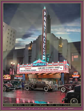 Built in 1930, the fabulous Pantages Theatre is the ultimate in Hollywood art deco style and opulance. Over the years it has been the scene of countless star-studded premiers and gala events, including the Academy Award ceremonies from 1950 thru 1959. It was once owned by Howard Hughes, who even had an office upstairs. In the scene I have created, the year is 1934, and the dazzling premier of Frank Capra’s classic film “It Happened One Night” is in progress. The cops hold back adoring fans as Clark Gable, "The King of Hollywood" (in a white suit) emerges from an incredible 1933 Duesenberg "Twenty Grand" sedan. Today the Pantages' exterior looks fairly original, although it was necessary for me to recreate all of the original neon on the sign and marquee, as it was replaced decades ago with a much more simplified version. -- L.G. |