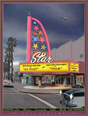 Located in Oceanside California, The Star Theatre opened in 1956, and boasted the largest marquee in San Diego County. In this scene, the 1957 film "Jet Pilot", starring John Wayne and Janet Leigh, is on a double bill with "Them", a 1954 film about giant ants that go on a rampage! (Ps. That's my 1961 Nash Metropolitan Convertible in the foreground) -- L.G. |