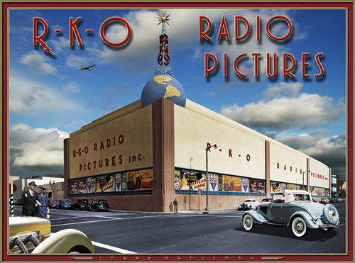 Founded in 1929, RKO is considered to be one of the "Big five" studios from Hollywood's Golden Age. Located on the corner of Melrose Avenue and Gower Street (near the famed "Gower Gulch") in Hollywood, the studio was responsible for many classic films including "King Kong" and "Citizen Kane". It's roster of stars included Fred Astaire, Ginger Rogers, Katherine Hepburn, Cary Grant, Robert Mitchum, and John Wayne, to name a few. In the late 1940's it was run (disastrously) by Howard Hughes, and by 1957 had completely shut down production. Today the studio is part of neighboring Paramount Studios, and is used mainly for the production of TV shows. -- L.G. |