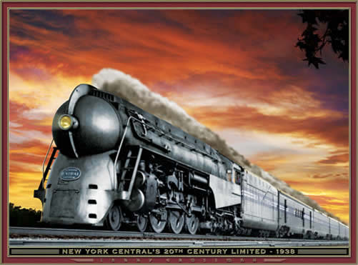 It's sunrise as a 4-6-4 Hudson class J-3 roars down the track in 1938. Designed by Henry Dreyfus for the New York Central Railroad, this train remains one of the most beautiful examples of Art Deco streamlining ever created. -- L.G. |