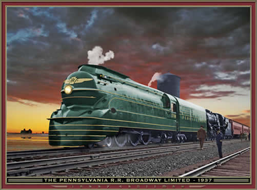 The beautifully streamlined "Broadway Limited" was Pennsylvania Railroads premier intercity passenger service between New York and Chicago in the 1930's. Styled by famed designer Raymond Loewy, it is seen here in 1937, taking on water along the route. |