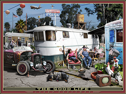 It's chowtime in middle America, and this laid-back trailer park couple was kind enough to invite their neighbor over for a beer and some tasty BBQ ...let's just hope he likes road kill! -- L.G.