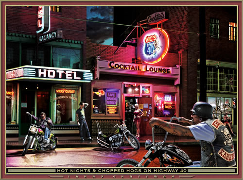 The "Krotch Kannibals" bike gang, proudly sporting their club "colors", kick start their chopped hogs to split "Vic's Highway 40 Bar and Cocktail Lounge" in Reno ...and from the looks of that chick in the doorway with the whip, just in time! Meanwhile, next door at the infamous Morrison Hotel (ala the Doors album - in fact, if you look closely you'll see Mr. Morrison on the left, hiding out) a young "lady" is clearly looking for a customer. And what about that action in front of, and especially above the barber shop ...where two young ladies seem to be involved in something kinda kinky (or am I just imaging things)? -- L.G. |