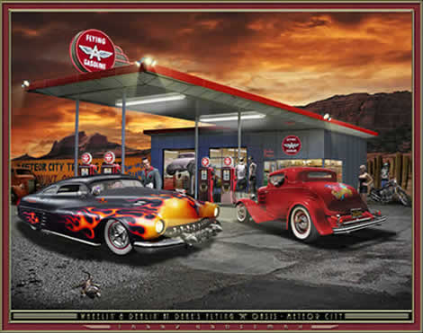 The desert sun has just set on Deke's Flying 'A' Oasis out on old Route 66, as the driver of a full-fendered '32 3-window coupe pulls in to discuss business with one of the local "working" girls. Meanwhile, her "manager" wheels and deals with the guy in the radically chopped and sectioned '50 Merc sled. On the island, two "pump jockeys" shoot the breeze, and off to the right an old school biker takes a much needed break from his long hard ride (choppers ain't comfy!), watering the desert flora and fauna in the process! -- L.G. |