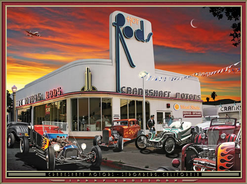 A Lockheed Constellation airliner flies low over this stylish art deco dealership which advertises "Hot Rods" on it's sign ...and they aren't kidding! Parked at the curb is Norm Grabowski's iconic "77 Sunset Strip Kookie Car" (the first T-bucket rod ever built!). And on the lot are an assortment of famous rods, including Roth's "Outlaw" (with a sign that says "one owner"),and Barris' "Ala Kart" (with a sign that says "low miles"). Inside the showroom you can spot three legends, as Ed "Big Daddy" Roth, George Barris, and Von Dutch all stand around Barris' "XMSC-210 Speed Coupe". (Ps. I appear in this picture as the salesman in the blue “sharkskin” suit by the showroom door) -- L.G. |
