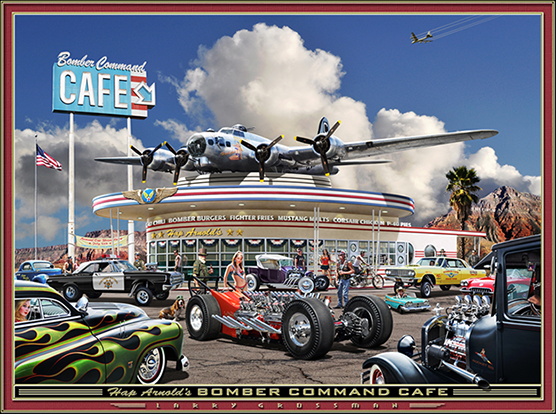 Cool place, but who the heck is Hap Arnold you ask? Only the Commanding General of the whole dang Army Air Force during World War II. So the fact that Hap's got an awesome B-17 Bomber mounted on the roof of his 1940's style cafe should come as no surprise ...or so I reasoned when I created this picture! The scene is of a Fourth of July Car Show with some extremely cool cars on display, including Tommy Ivo's legendary four-engine Dragster; a full-blown '64 Dodge Muscle Cop Car; a bad-ass Hog Chopper; a chopped Merc lead-sled; a straight-axle '64 Chavelle gasser; a classic '59 Vette; Stone Woods & Cook's famous '40 Willys gasser ...and jeez, there's even a kid toolin' around in a pint-sized Plymouth pedal car! And of course there's a bevy of beautiful babes and cool dudes to complete the scene.-- L.G. |